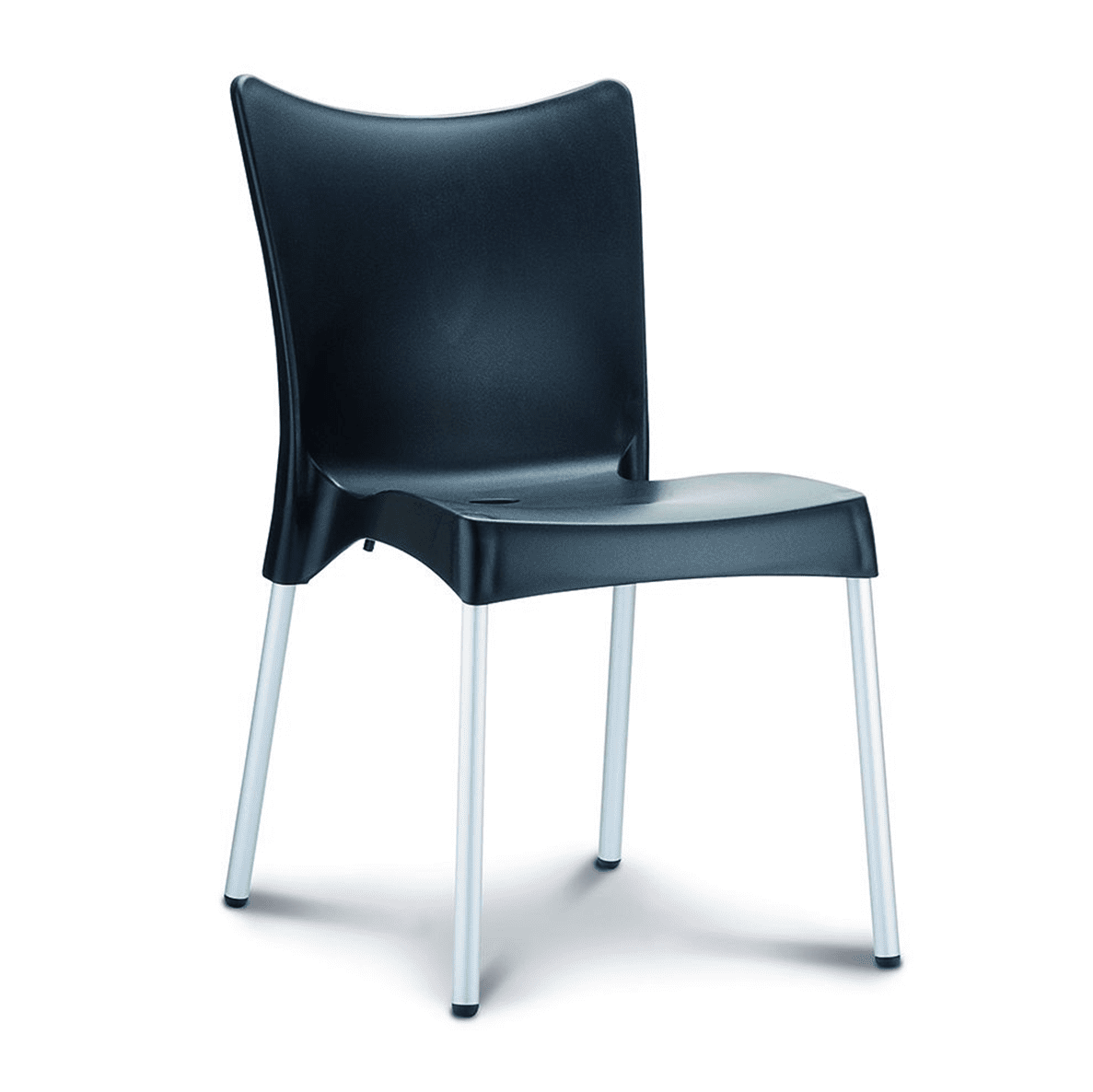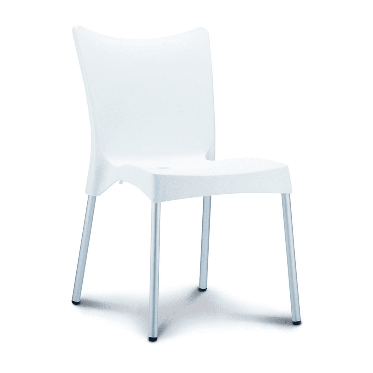 Stapelbare stoel met een kunststof zitting en rug in 100% recyclebaar polypropyleen en 25mm poten in geanodiseerd aluminium. Geschikt voor binnen en buiten.